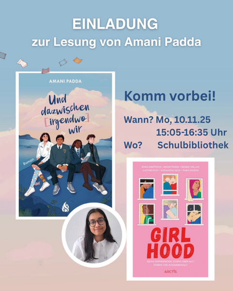 Am Montag, 10.11.25 findet von 15:05-16:35 Uhr in der Schulbibliothek eine Lesung der Jugendbuchautorin Amani Padda statt. Die Autorin wird aus ihrem Roman „Und dazwischen [irgendwo] wir“ sowie aus der Kurzgeschichtensammlung „Girlhood“ vorlesen. Außerdem wird sie über queere Repräsentation in Büchern und Filmen sprechen. Es wird spannend!